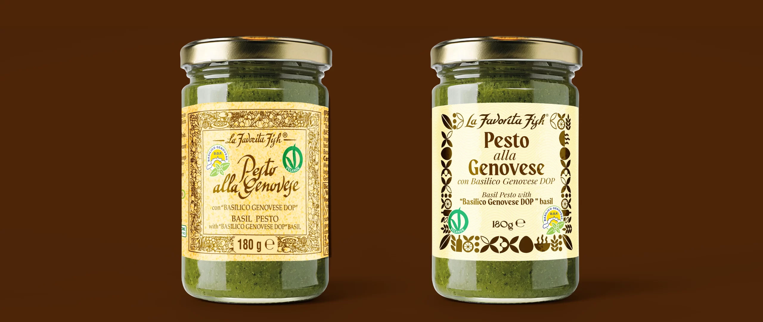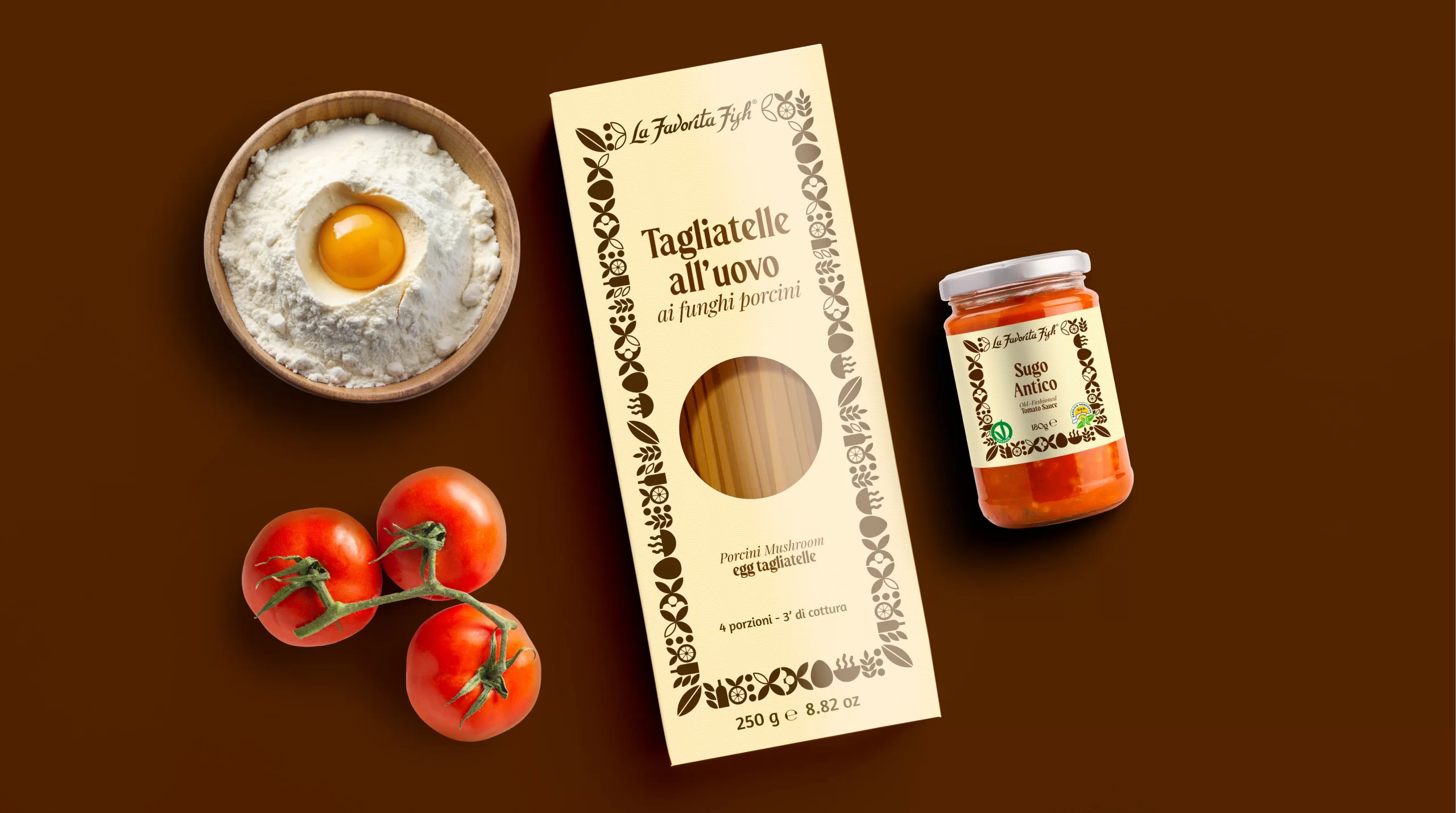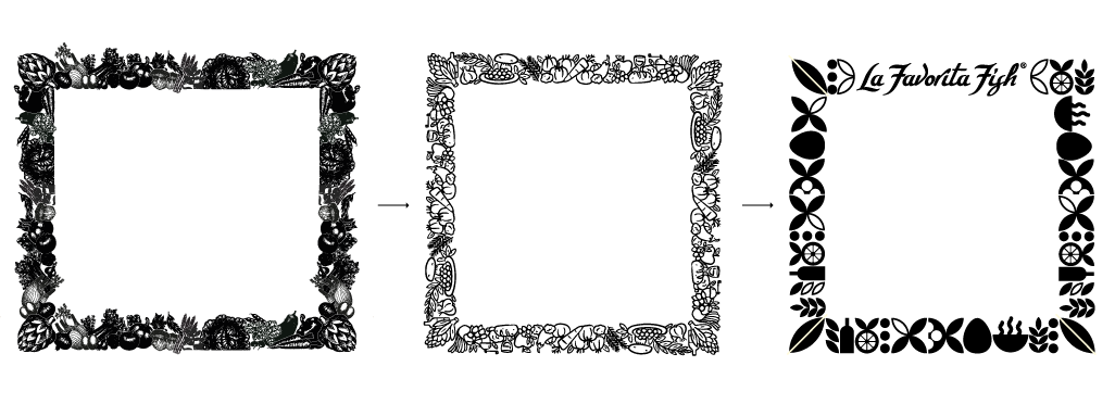 Il primo elemento su cui si è concentrato il restyling del packaging è stata la cornice. L’obiettivo era rendere i prodotti “La Favorita Fish” più appetibile per un pubblico più giovane, dinamico e attento allo stile. Il nuovo design ridisegna gli elementi grafici della cornice sostituendoli con linee più pulite, semplici e contemporanee. L’uso di motivi geometrici e di un layout più ordinato permette al packaging di trasmettere immediatamente un senso di modernità, senza risultare eccessivamente minimalista o perdere il richiamo all’autenticità italiana.